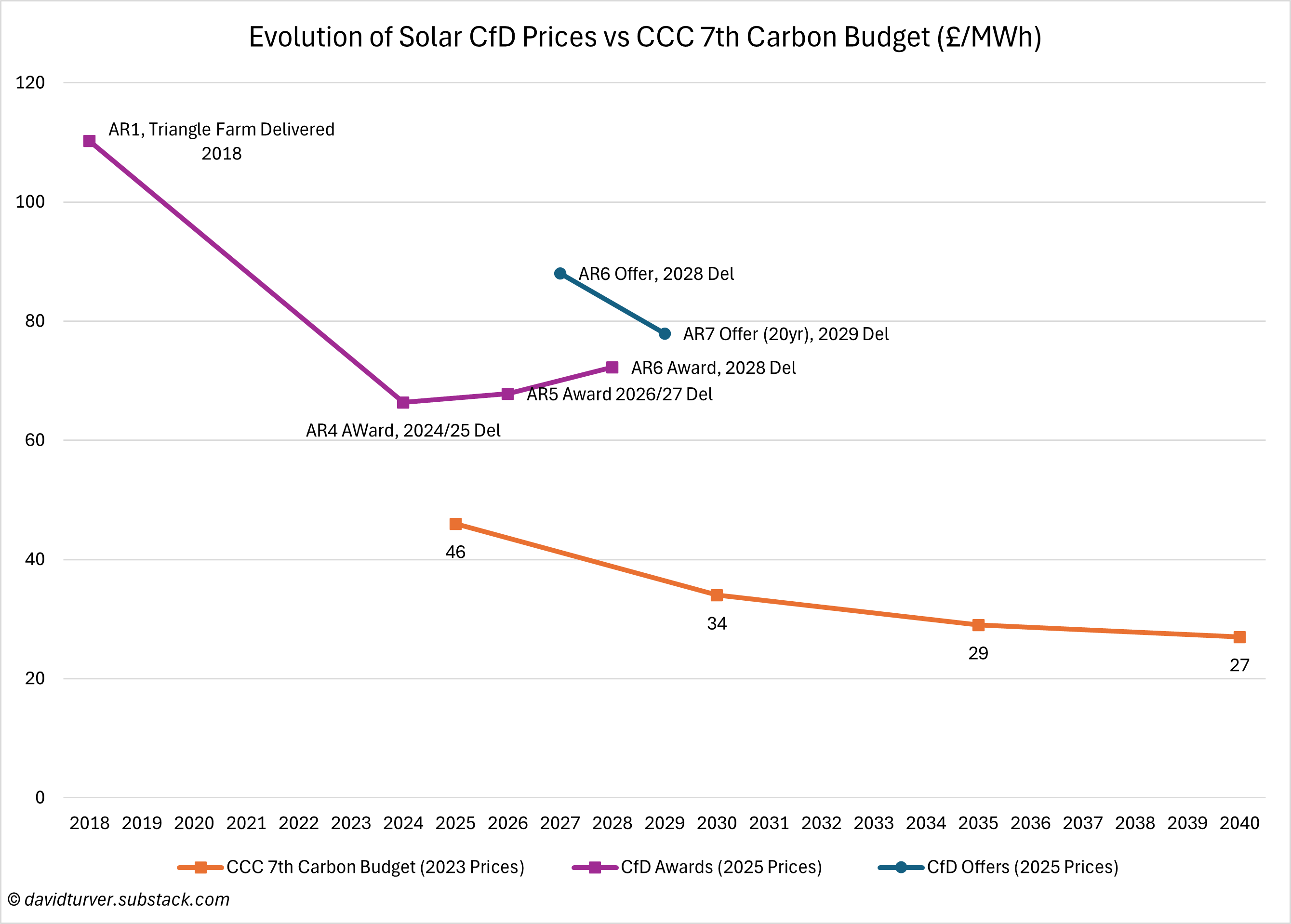 The AR6 contract awards at £72/MWh at 2025 prices are more than double the CCC’s estimate of £34/MWh for 2030 delivery. The 20-year contracts on offer for AR7 are even more expensive at £78/MWh.