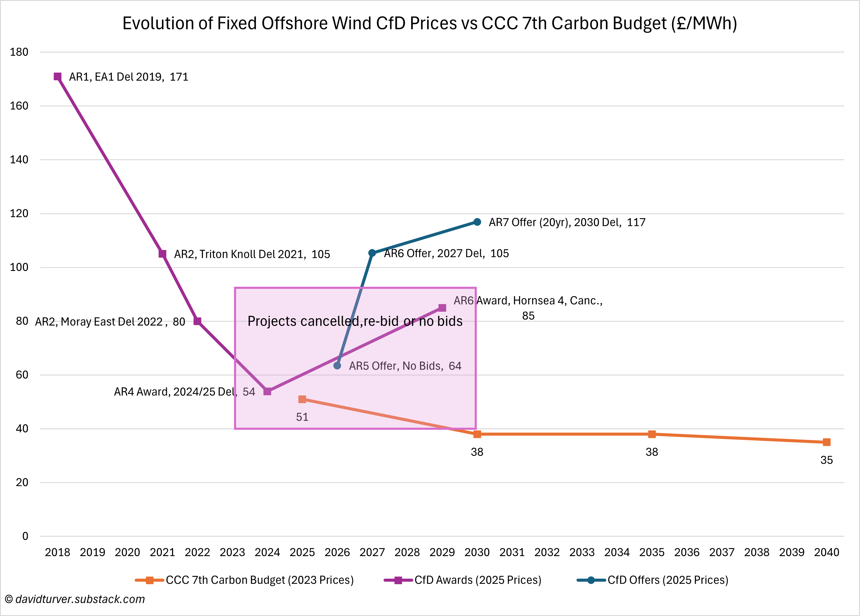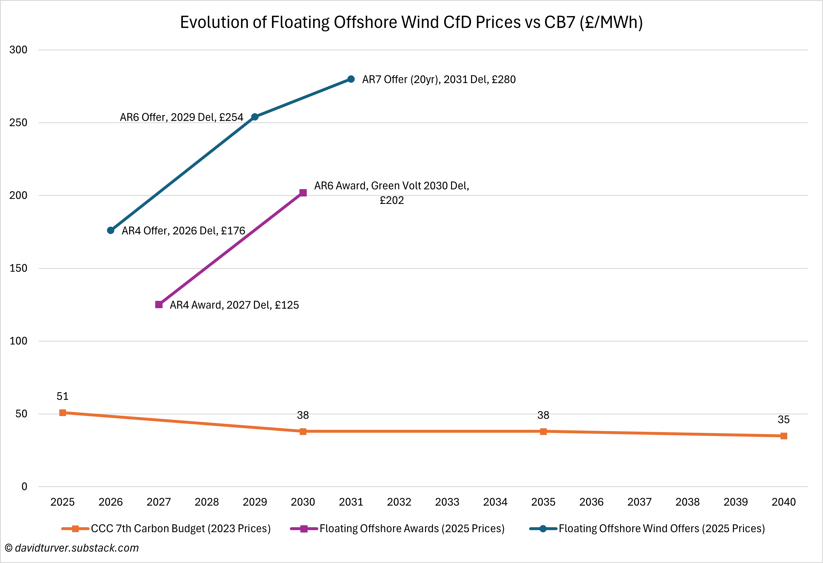 Green Volt won a contract in AR6 at £202/MWh in today’s money, more than five times the CCC’s estimate. Floating offshore wind contracts are being offered £280/MWh in 2025 prices in AR7, more than seven times the CCC’s estimate.