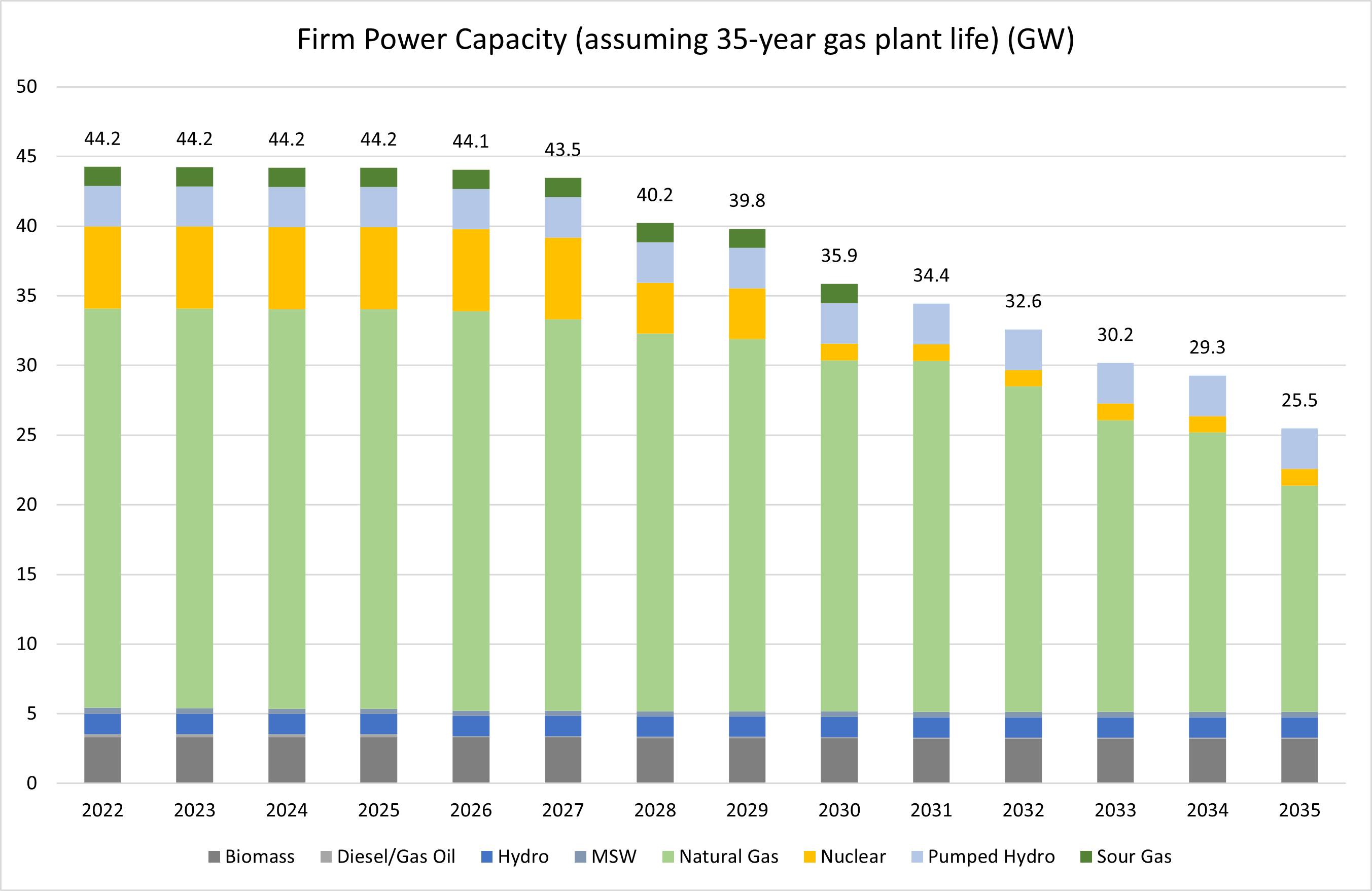 The case for reopening coal mines and restarting or rebuilding UK coal-fired generation capacity is made stronger when the state of our electricity generation system is considered. Our gas fleet is ageing and of course the last coal power plant was turned off in 2024. The typical operational life for a gas plant is 25–30 years. With careful maintenance, lives could possibly be extended up to 40 years. However, intermittent operation can reduce component life again. Using plant data from the Digest of UK Energy Statistics (DUKES) and assuming a 35-year life for our gas fleet, we can see in Figure 2 that firm power capacity starts to fall rapidly in 2028 and by 2035 is down to just 25.5GW (or 28.8GW if Hinkley Point C is online by then).
