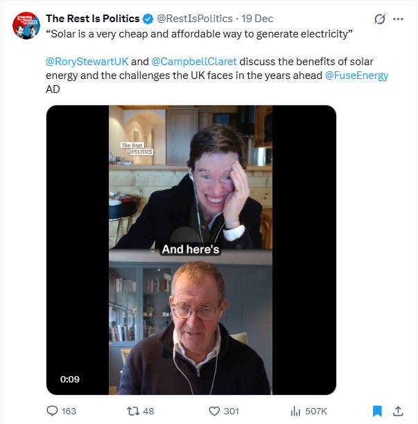 It is even worse that The Rest is Politics has been sponsored to spout this propaganda by a lossmaking renewable energy company with a weak balance sheet apparently not in compliance with Ofgem financial resilience rules. Of course, Ofgem is now fully bought into the Net Zero narrative too, so is of course not enforcing its own rules. When facts are ignored and the truth is hidden then what is left is simply empty narrative and spin. Perhaps their podcast should be renamed as The Rest is Propaganda.