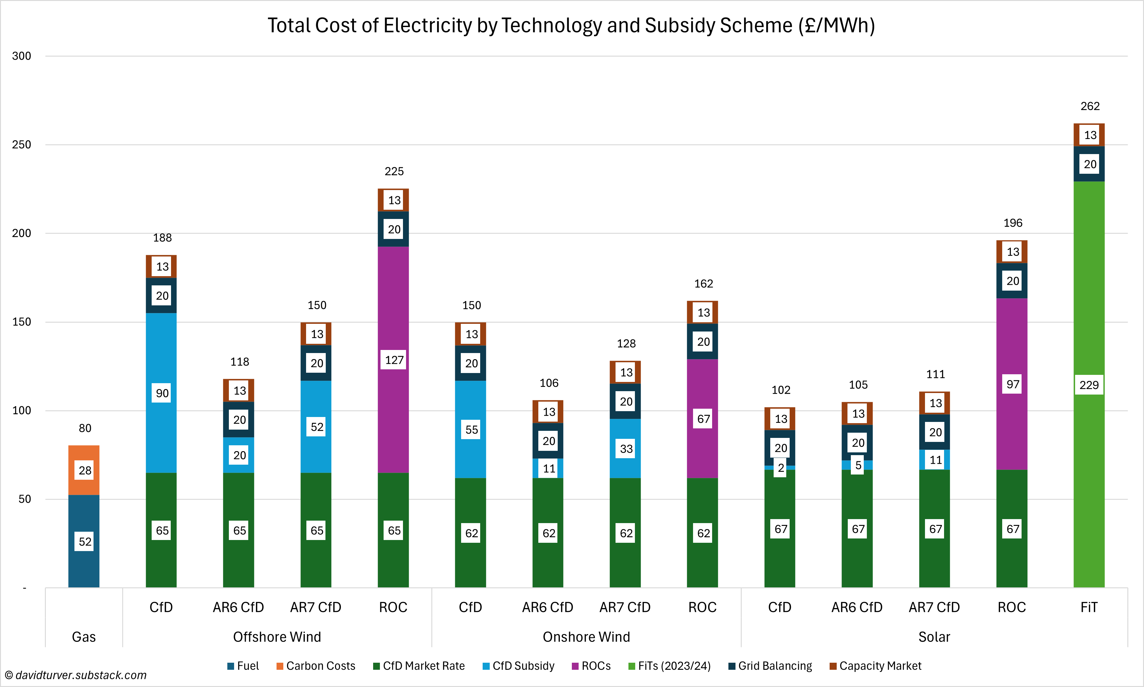The basic cost of solar power from Feed-in-Tariffs is the most expensive renewable electricity we produce, costing £229/MWh in FY2024/25. The cost of grid balancing and backup needs to be added to that figure. Grid balancing adds about £20/MWh to the cost of intermittent renewables and backup from the capacity market about £13/MWh giving a total of £262/MWh, or more than three times the cost of gas-fired electricity, which is currently around £80/MWh including carbon costs of about £28/MWh.