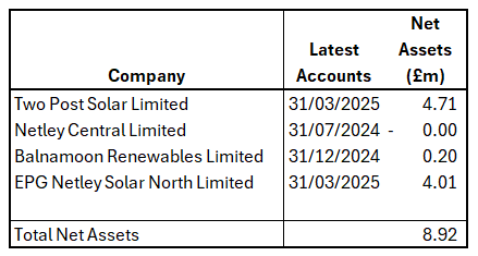 The companies are Two Post Solar Limited, EPG Netley Solar North Limited, Balnamoon Renewables Limited and Netley Central Limited. The first two are solar farms, Balnamoon is a single turbine wind farm and Netley Central is a new company incorporated in 2023 with negative net assets of just £2,579 in the latest accounts made up to 31 July 2024. The bulk of the assets are in the other three companies and the latest accounts of these companies have recently been published, see Figure 5.